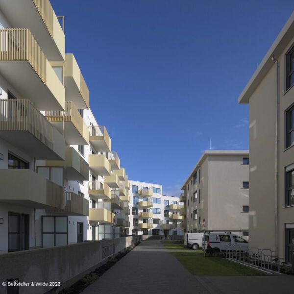 Neubau eines Wohnquartiers mit 156 barrierefreien Wohneinheiten in 9 Gebäuden und Tiefgarage mit 200 Stellplätzen als Generalplaner.